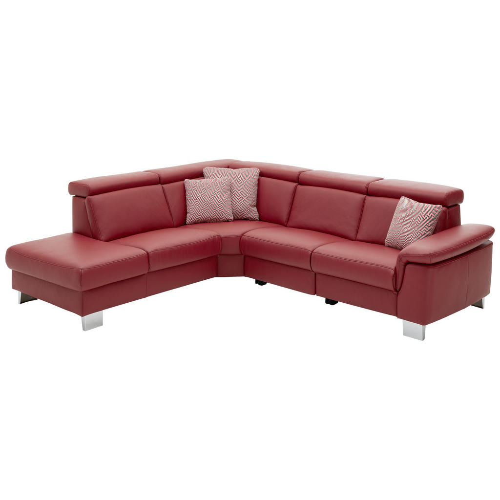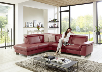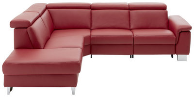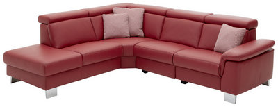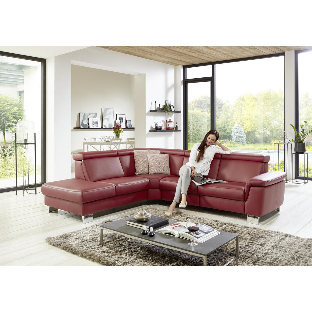 '_Seht mich an, ich bin hier!'_, ruft diese Wohnlandschaft in Rot mit Echtleder-Bezug. Durch die auffällige Farbe bringt sie Leben in Ihr Zuhause. Sie sind ein extrovertierter Mensch? Dann passt dieser Blickfang zu Ihnen wie die Faust aufs Auge, denn er fällt von Kopf bis Fuß auf. Die Füße begeistern in glänzendem Stahl, als trüge die Sitzgelegenheit extra chice Schuhe. Das Möbel lässt sich individuellen planen, von der Lederart bis hin zu den gewünschten Features. Gegen Aufpreis erhalten Sie in unseren Filialen sowie online auf Anfrage zahlreiche Varianten, Farbalternativen, Zubehörteile und Beimöbel. Die Polsterung besteht aus einem weichen Polyetherschaumkern, der das Sofa gemütlich macht. Mit einem Schenkelmaß von etwa 233 x 270 cm bietet die L-förmige Couch Platz für ca. 5 Personen. Die Wohnlandschaft in Rot mit Echtleder motiviert – lassen Sie zu, dass die Welt Sie sieht!