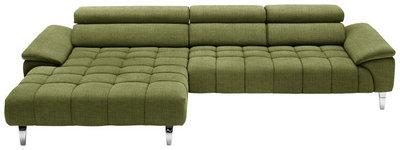 Diese Wohnlandschaft (L-Form) mit Kopfteilverstellung beeindruckt durch ihre Vielseitigkeit. Denn auf 3 Sitzflächen machen Sie es sich individuell nach Ihren Bedürfnissen gemütlich. Dank einzeln sowie mehrfach verstellbarer Kopfteile mit Rasterfunktion ist die ideale Position für den Nacken garantiert, ob Sie ein Buch lesen oder sich entspannt zurücklehnen. Sie möchten dabei gerne die Füße hochlegen? Das macht die praktische L-Form möglich. Oder Sie strecken sich quer auf dem Polstermöbel aus und gönnen sich eine erholsame Pause. Damit die kuschelige Auszeit zu einem noch genüsslicheren Erlebnis wird, ist die Ruheoase mit einer Kaltschaumpolsterung ausgestattet. Diese gibt an den richtigen Stellen nach und erweist sich als wahre Wohltat für den Rücken. In Kombination mit der hochwertigen Wellenunterfederung profitieren Sie von komfortabler Qualität. Ein Highlight ist die Optik der Wohnlandschaft: Der Bezug aus Mikrofaser präsentiert sich im dezentem Grün mit einer markanten Steppung – diese beweist Liebe zum Detail und ein ausgefeiltes Designkonzept. Für ein harmonisches Finish sorgen die eckigen Füße in modernen Chromfarben. Dank echt bezogenem Rücken stellen Sie das Sofa frei im Raum auf. So setzen Sie Ihr Wohnkonzept ganz nach Ihren Wünschen um und fühlen sich rundum wohl in Ihrem Zuhause. Gegen Aufpreis erhalten Sie in unseren Filialen sowie online auf Anfrage zahlreiche Varianten, Farbalternativen, Zubehörteile wie eine Sitztiefenverstellung und Beimöbel. Auf dieser Wohnlandschaft (L-Form: ca. 190 x 329 cm) mit Kopfteilverstellung machen Sie es sich mit Behaglichkeit nach Maß bequem!