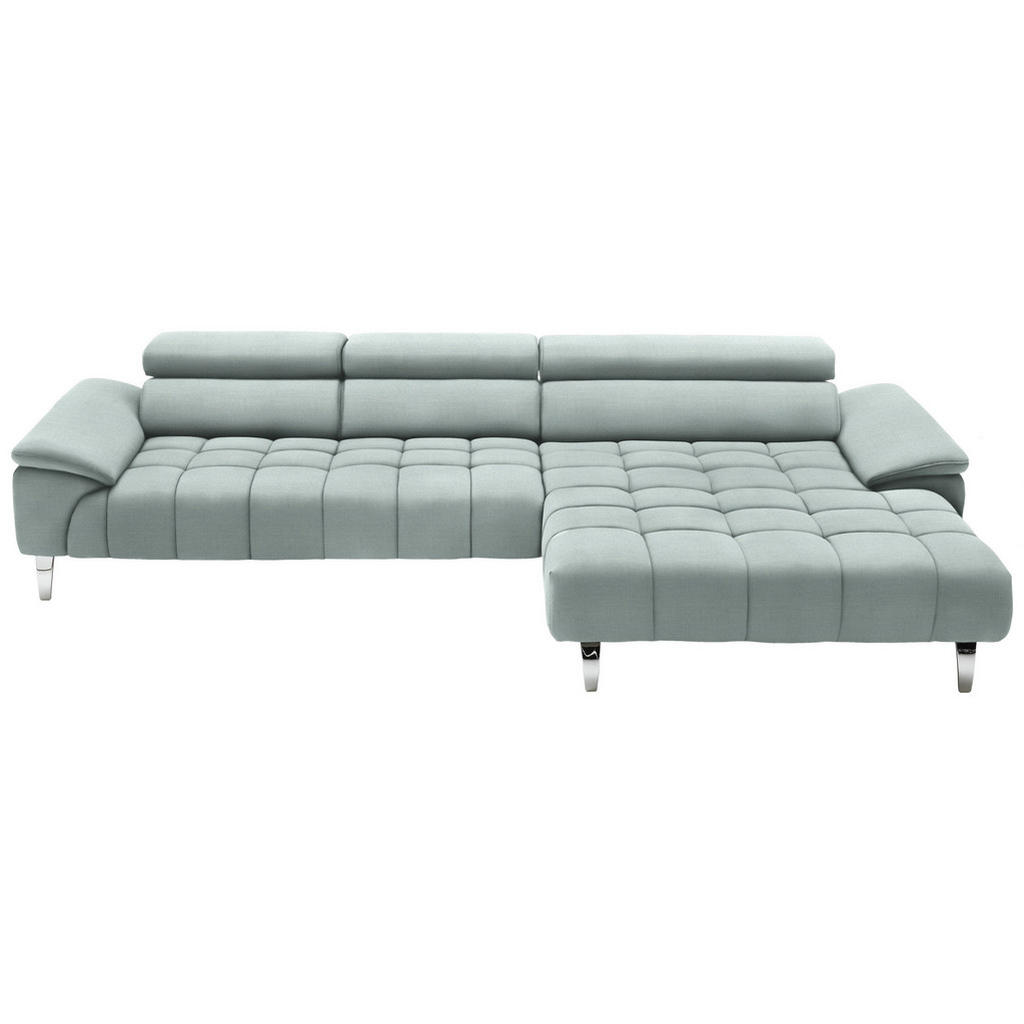 Diese Wohnlandschaft (L-Form) mit Kopfteilverstellung beeindruckt durch ihre Vielseitigkeit. Denn auf 3 Sitzflächen machen Sie es sich individuell nach Ihren Bedürfnissen gemütlich. Dank einzeln sowie mehrfach verstellbarer Kopfteile mit Rasterfunktion ist die ideale Position für den Nacken garantiert, ob Sie ein Buch lesen oder sich entspannt zurücklehnen. Sie möchten dabei gerne die Füße hochlegen? Das macht die praktische L-Form möglich. Oder Sie strecken sich quer auf dem Polstermöbel aus und gönnen sich eine erholsame Pause. Damit die kuschelige Auszeit zu einem noch genüsslicheren Erlebnis wird, ist die Ruheoase mit einer Kaltschaumpolsterung ausgestattet. Diese gibt an den richtigen Stellen nach und erweist sich als wahre Wohltat für den Rücken. In Kombination mit der hochwertigen Wellenunterfederung profitieren Sie von komfortabler Qualität. Ein Highlight ist die Optik der Wohnlandschaft: Der Bezug aus Mikrofaser präsentiert sich im dezentem Mintgrün mit einer markanten Steppung – diese beweist Liebe zum Detail und ein ausgefeiltes Designkonzept. Für ein harmonisches Finish sorgen die eckigen Füße in modernen Chromfarben. Dank echt bezogenem Rücken stellen Sie das Sofa frei im Raum auf. So setzen Sie Ihr Wohnkonzept ganz nach Ihren Wünschen um und fühlen sich rundum wohl in Ihrem Zuhause. Gegen Aufpreis erhalten Sie in unseren Filialen sowie online auf Anfrage zahlreiche Varianten, Farbalternativen, Zubehörteile wie eine Sitztiefenverstellung und Beimöbel. Auf dieser Wohnlandschaft (L-Form: ca. 329 x 190 cm) mit Kopfteilverstellung machen Sie es sich mit Behaglichkeit nach Maß bequem!