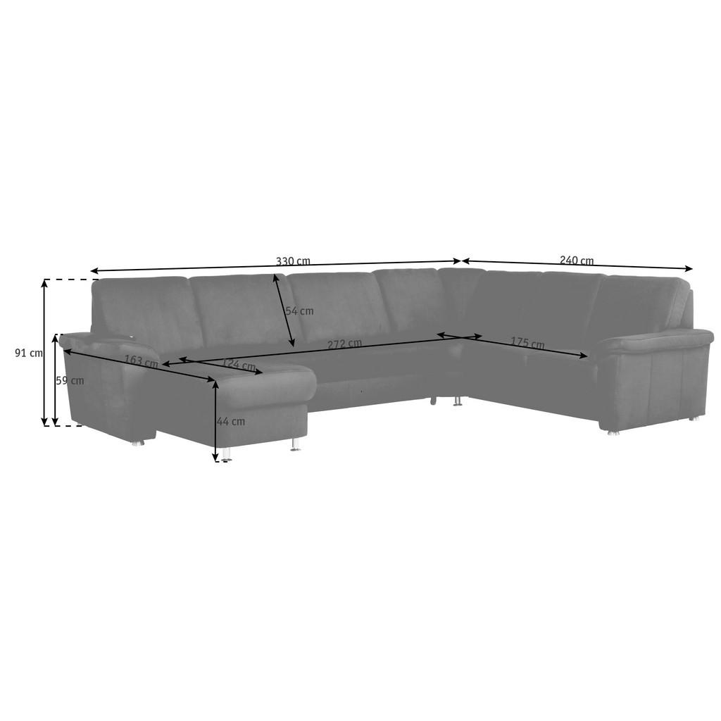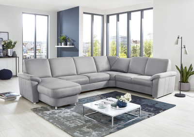 Diese Wohnlandschaft (U-Form) in Grau mit Maßen von ca. 163 x 330 x 240 cm ist die perfekte Grundlage zum Ausruhen. Dabei können Sie auf der Ottomane links sowie auf dem längeren Schenkel rechts sogar die Beine hochlegen, während Sie lesen, einen Film schauen oder sich angeregt unterhalten. Gemütlich ist das Möbel, das auf Metallfüßen in Chromfarben steht, durch eine Kombination aus Wellenunterfederung in Verbindung mit Federkern und Polyetherschaumkern. Beim täglichen Entspannen kommt Ihnen neben der Polsterung die Qualität des Polyesterbezugs in dem Grauton '_Holiday Alu'_ zugute, der nicht zur Pillingbildung neigt. Er zeichnet sich durch eine sehr gute Abriebfestigkeit und gute Lichtechtheit aus. Gegen Aufpreis erhalten Sie in unseren Filialen sowie online auf Anfrage zahlreiche Varianten, Farbalternativen, einen passenden Hocker sowie Zubehörteile vom Bettkasten bis hin zur Nackenstütze. Ihre neue Wohnlandschaft (U-Form) in Grau lädt zum ausgiebigen Relaxen ein!
