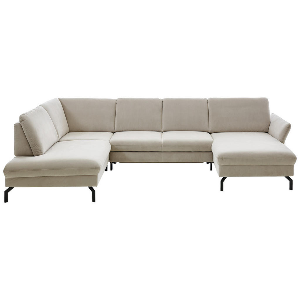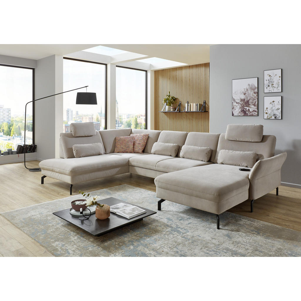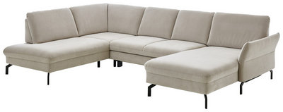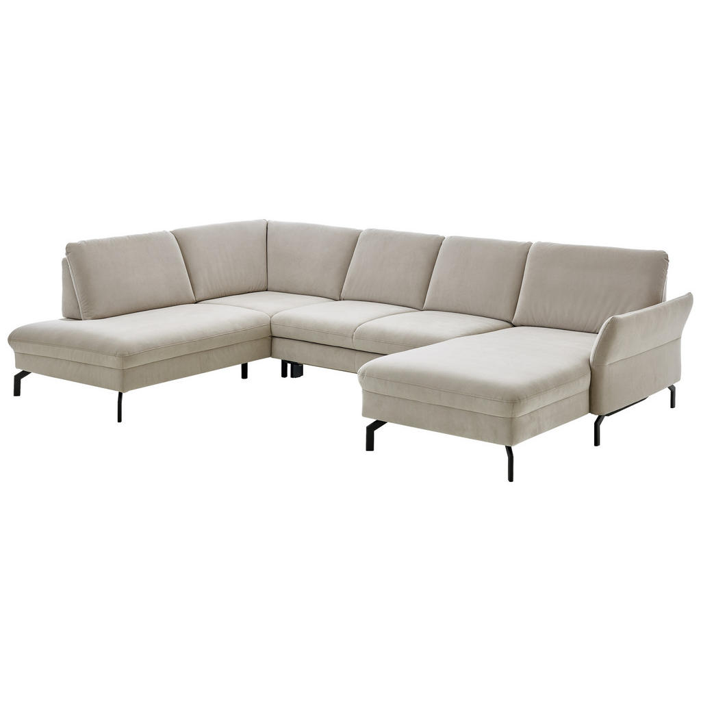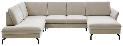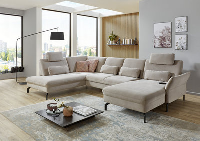 Auf dieser Beldomo System Wohnlandschaft in U-Form mit Federkern genießen Sie eine entspannte Auszeit. Über das Innenleben spannt sich eine Hülle mit Flachgewebe-Oberfläche, die sich als ausgesprochen robust präsentiert: Mit der ziemlich guten Lichtechtheit sowie der Abriebfestigkeit bis ca. 100.000 Scheuertouren zeigt sich das Möbel stets von seiner besten Seite. Zusätzlich wartet die Couch mit 2 Ottomanen auf, die zum Ausstrecken und Füße hochlegen einladen (Umfang: ca. 220 x 335 x 179 cm) Das Design besticht mit moderner Leichtigkeit. Dies untermalen die klare Linienführung sowie die dünnen Metallfüße in Schwarz. Schließlich betonen die schmalen Armlehnen (Breite: ca. 19 cm) das minimalistische Auftreten. Der Bezug in Graubraun mit echt bezogenem Rücken erscheint in elegantem Kolorit, das einen stilvollen Akzent in Ihren vier Wänden setzt. Gegen Aufpreis erhalten Sie in unseren Filialen sowie online auf Anfrage zahlreiche Zubehörteile und Beimöbel. Auf dieser U-förmigen Wohnlandschaft mit Federkern lassen Sie die Seele baumeln!