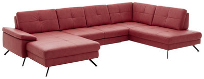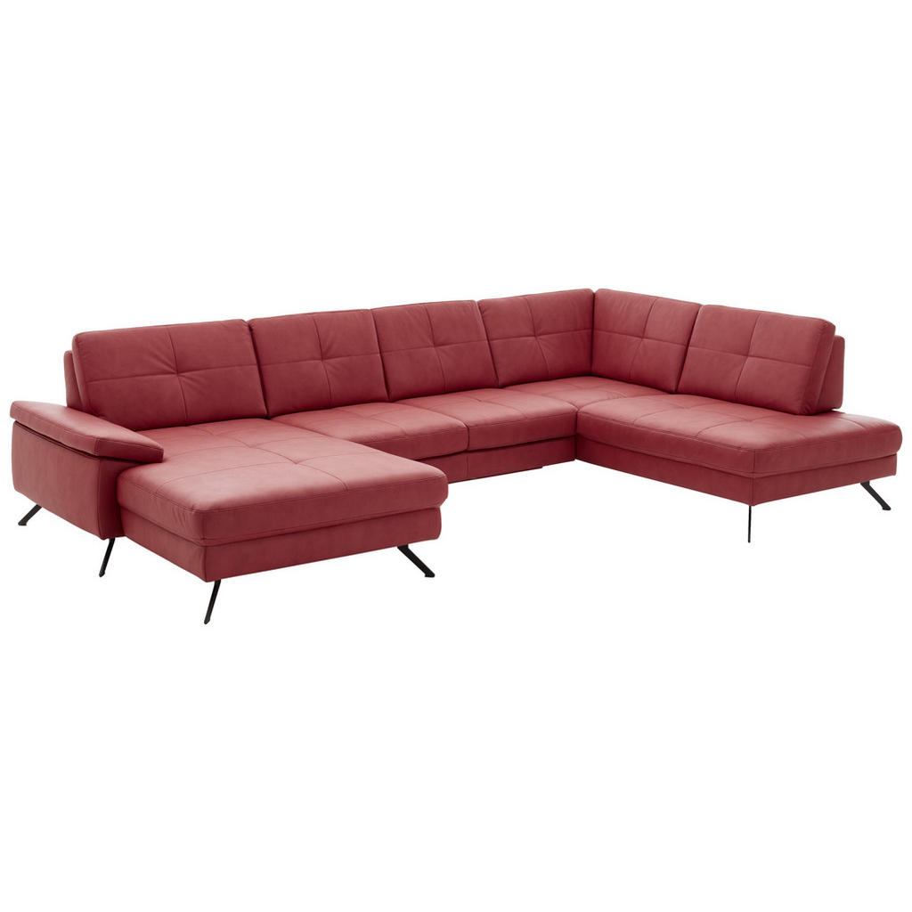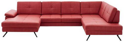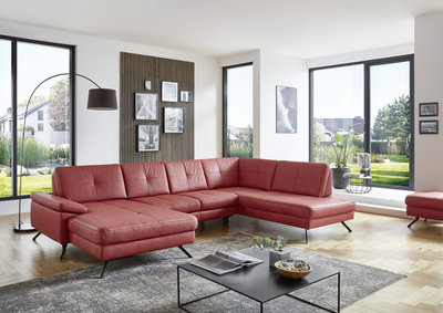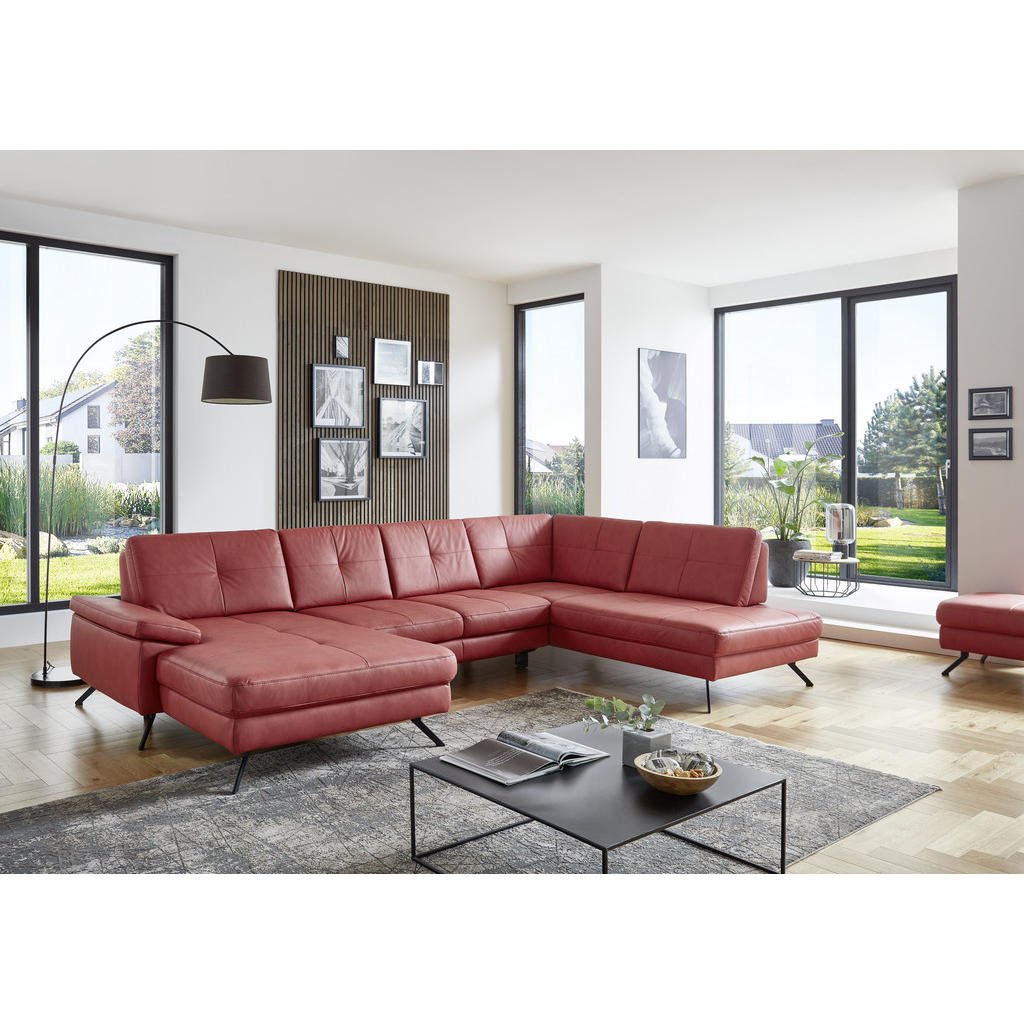 Alles andere als schlicht zeigt sich diese U-förmige Wohnlandschaft in Rot. Sie wollen ein Statement setzen und mit einem Eyecatcher Ihr Interieur erweitern? Dann eignet sich die Couch ideal. Sie fällt auf den ersten Blick wegen der intensiven Koloration auf, überzeugt jedoch ebenso bei genauerer Inspektion. Die glatte Oberfläche in Kombination mit der minimalistischen Steppung erzeugt einen eleganten Look, welcher von den Winkelfüßen aus Stahl aufgegriffen und fortgeführt wird. Auch in Bezug auf den Komfortfaktor bleiben keine Wünsche offen. Sie nehmen Platz auf einer weichen Kaltschaumpolsterung und legen auf den beiden Ottomanen gemütlich die Füße hoch. Dabei sorgt eine Sitztiefe von ca. 68 cm für genügend Raum, um es sich bequem zu machen. Bei einem Umfang von ca. 179 x 343 x 220 cm steht Ihnen sogar eine lange Seite zum Ausstrecken, für das ein oder andere Nickerchen, zur Verfügung. Stellen Sie das charakterstarke Sofa stilvoll unter einer Fotowand zur Schau oder setzen Sie es dank des echt bezogenen Rückens auch apart mitten im Zimmer in Szene. Gegen Aufpreis erhalten Sie in unseren Filialen sowie online auf Anfrage zahlreiche Varianten, Farbalternativen, Zubehörteile wie unter anderem Nierenkissen oder eine Bettfunktion und Beimöbel wie zum Beispiel einen praktischen Hocker. Diese Wohnlandschaft (U-Form) in Rot weckt garantiert die Aufmerksamkeit Ihrer Besucher!