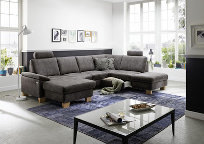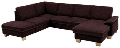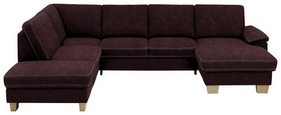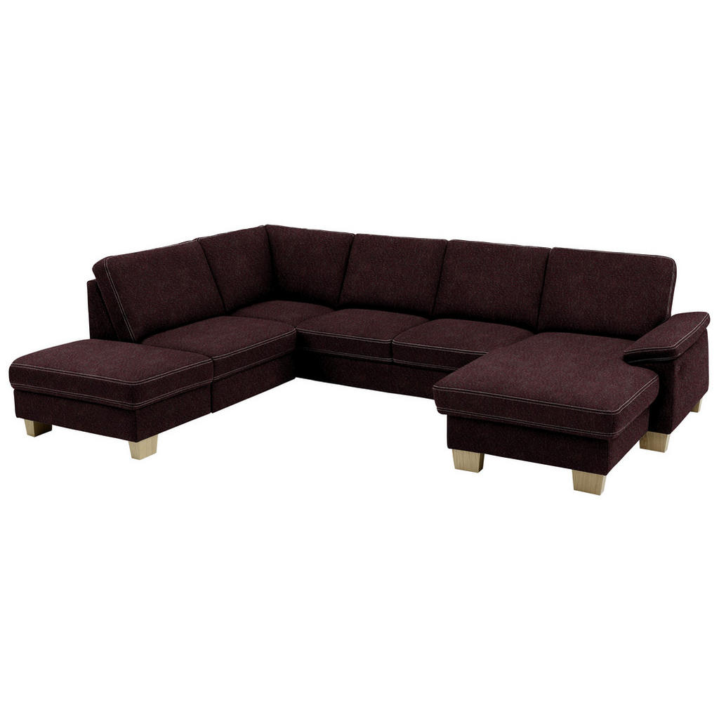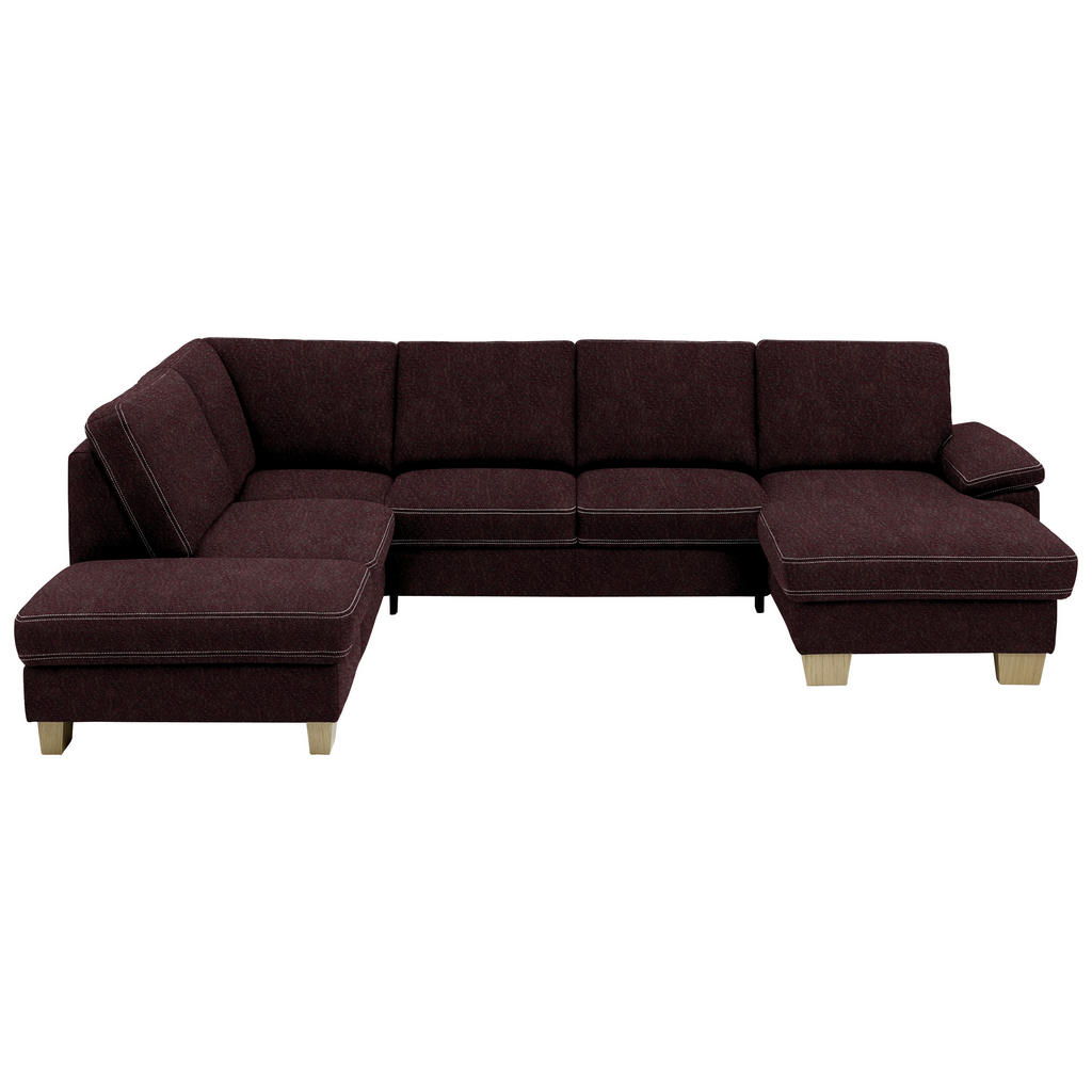 Diese Wohnlandschaft ist der gemütliche Mittelpunkt Ihres Wohnzimmers: Durch die offene U-Form findet hier die ganze Familie Platz. Auf bequemen Sitzflächen mit Kaltschaumpolsterung und Wellenunterfederung genießen Sie eine entspannte Zeit. Beim gemeinsamen Filmeabend mit Freunden fühlen sich auf diesem komfortablen Sofa alle wohl. Der Bezug in der Farbe Wine ist mit beigefarbenen Ziernähten abgesetzt. Das dunkle Rot macht das Sofa zu einem stilvollen Polstermöbel. Dank hellem Eichenfurnier schaffen die eckigen Füße eine natürliche Atmosphäre. Auch Übernachtungsgäste sind dank Schlaffunktion stets willkommen: Mit wenigen Handgriffen lässt sich das Sofa im Nu zu einem Gästebett ausziehen. Eine große Wohnlandschaft mit zahlreichen Ergänzungsmöglichkeiten! Gegen Aufpreis erhalten Sie in unseren Filialen zahlreiche Varianten, Farbalternativen, Zubehörteile und Beimöbel. Beispielsweise lässt sich Ihre neue Wohnlandschaft um Kopfstützen oder passende Zierkissen erweitern. Dadurch können Sie genau so auf dem Sofa sitzen, wie es für Sie am gemütlichsten ist!
