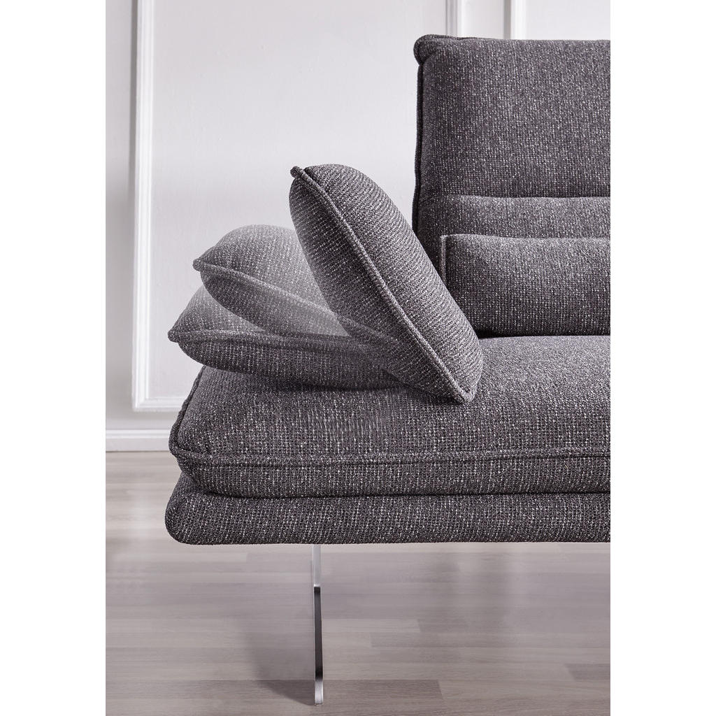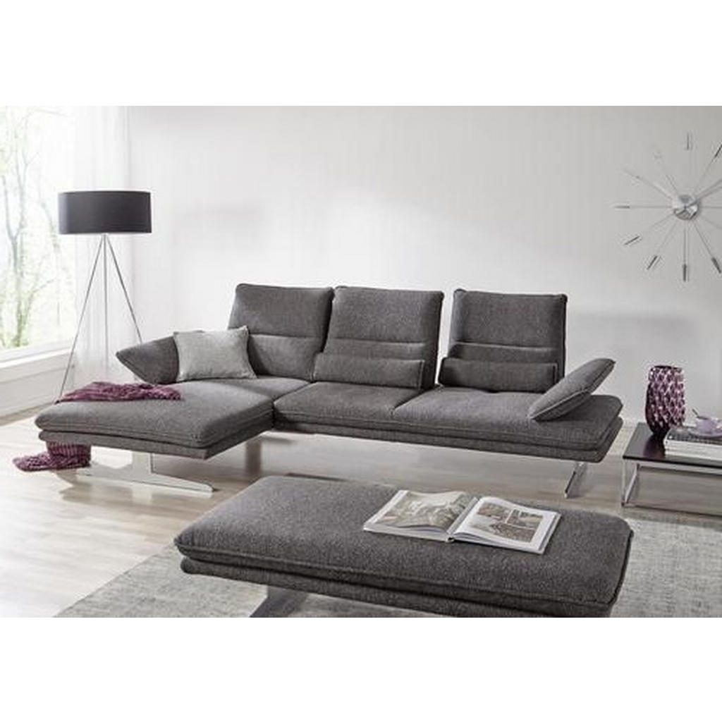 Jetzt relaxen Sie mit Stil – auf Ihrer neuen Wohnlandschaft in Anthrazit mit Sitztiefenverstellung. Das schlanke Design fügt sich elegant in Ihr Wohnzimmer ein und lässt sich dank echt bezogenem Rücken frei im Raum aufstellen. Auf den chromfarbenen Kufenfüßen scheint das Ecksofa beinahe zu schweben, sodass der anthrazitfarbene Bezug noch besser zur Geltung kommt. Moderne Optik und bester Komfort im optimalen Verhältnis: Auf der Polsterung mit Nosagunterfederung und einem in Schaumstoff eingearbeiteten Federkern lassen Sie ganz entspannt die Seele baumeln. Lieber aufrecht sitzend oder bequem zurückgelehnt – die integrierte Sitztiefenverstellung lässt Ihnen alle Freiheiten. Bei einem Glas Wein strecken Sie die Beine auf der Ottomane links aus. Das Sofa lässt keine Wünsche offen: Gegen Aufpreis erhalten Sie in unseren Filialen sowie online auf Anfrage zahlreiche Varianten, Farbalternativen, Zubehörteile und Beimöbel. Ergänzen Sie die Couch beispielsweise mit passenden Kissen, einer Kopfteilverstellung oder einem großzügigen Hocker. Machen Sie es sich gemütlich auf Ihrer Wohnlandschaft in Anthrazit mit Sitztiefenverstellung!